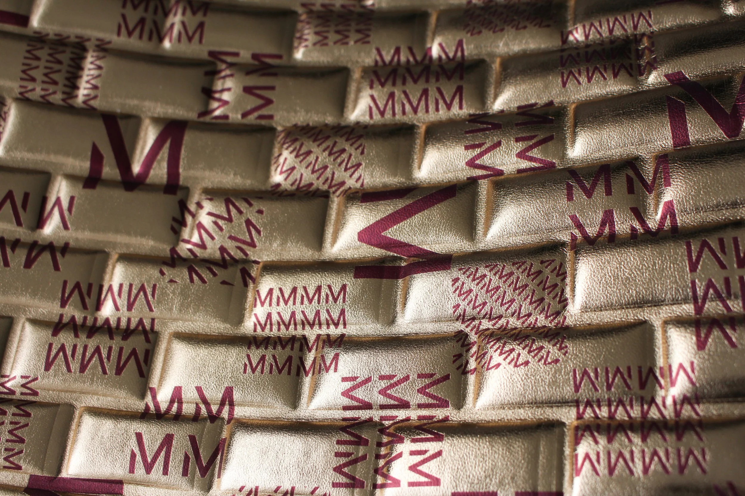 Quando il logo viene stampato su pelle laminata in oro con un processo di goffratura, crea un rilievo insolito e raffinato.